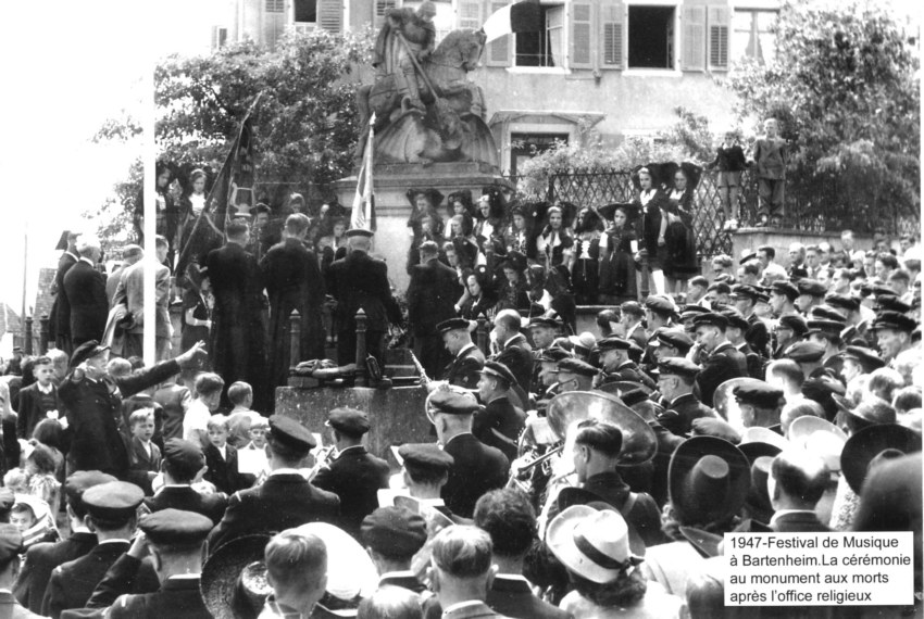 Ce jour-là, on inaugure le nouveau drapeau, intégralement financé par les commerçants du village. Représentant le blason de Bartenheim sur fond vert d'un côté avec la devise "SOYEZ UNIS", il reprend la lyre symbolique de l'harmonie sur un verso bordeaux.